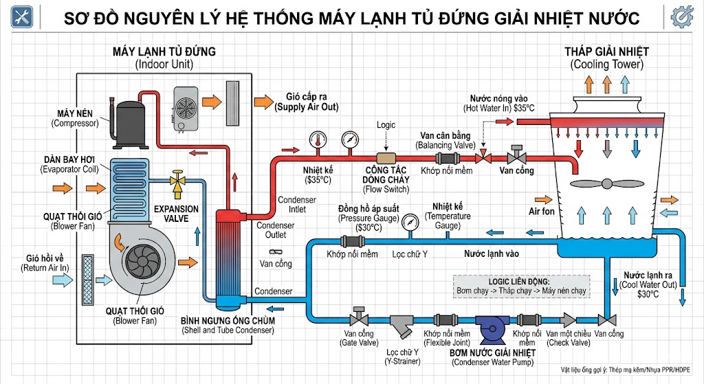 Máy lạnh tủ đứng giải nhiệt nước là gì? Nguyên lý, ưu điểm & cách lựa chọn phù hợp