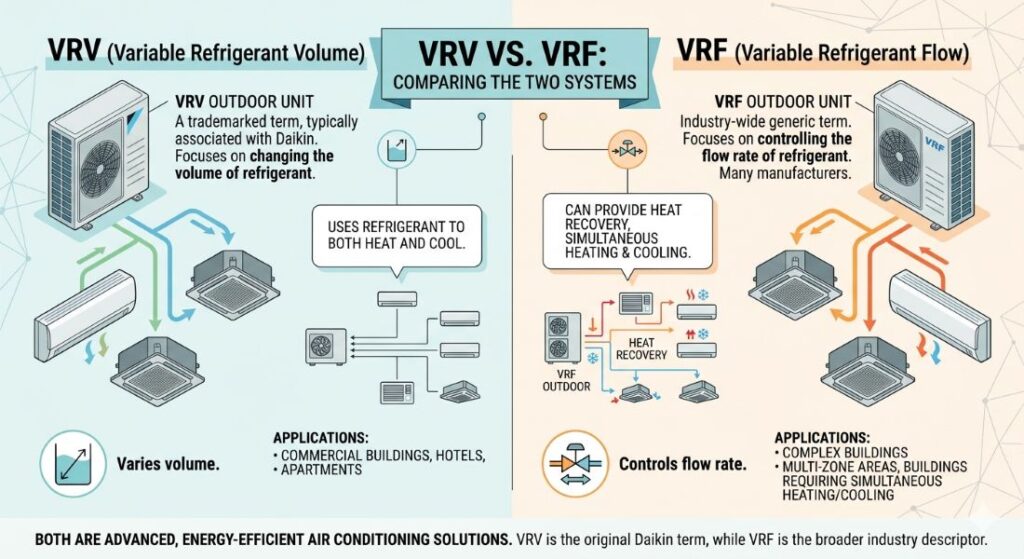VRV (Variable Refrigerant Volume) thực chất là tên gọi riêng của công nghệ VRF do Daikin đăng ký độc quyền.